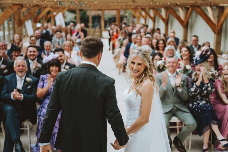 Holly walking down the aisle with her father in the Hay Barn at Blake Hall, Ongar, autumn bouquet of burnt orange and deep red florals, guests lining the aisle, October 2025 – wedding photography by Tel, Lily & White