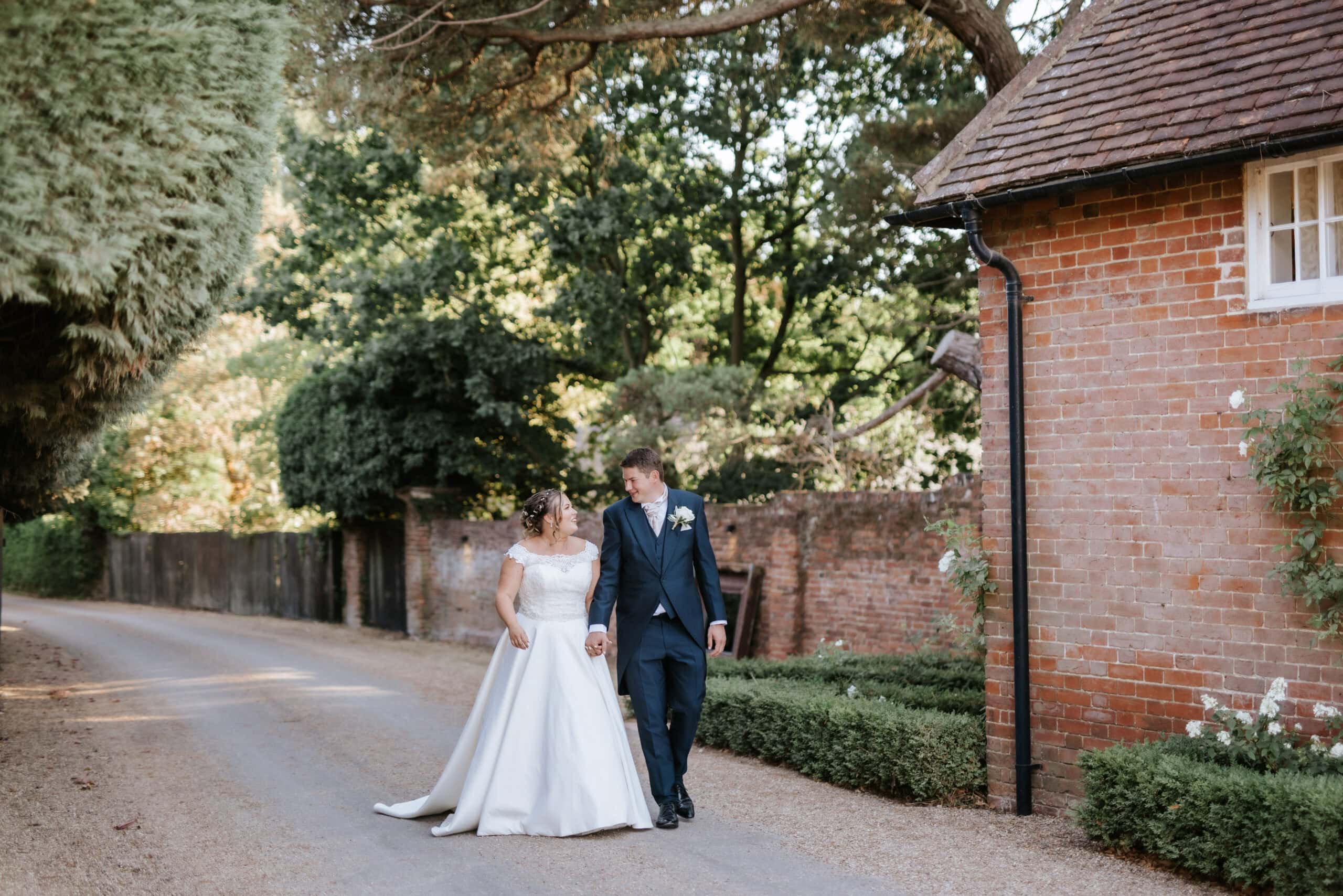 couple walking through Gaynes Park wedding venue in Essex.